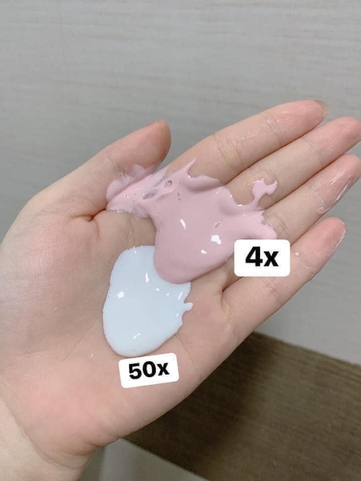 4x chất kem đặc hơn màu hồng khi bôi kem lâu ngấm hơn và fai xoa kỹ xoa lâu hơn 50x nhưng bật tone rõ hơn 50x
