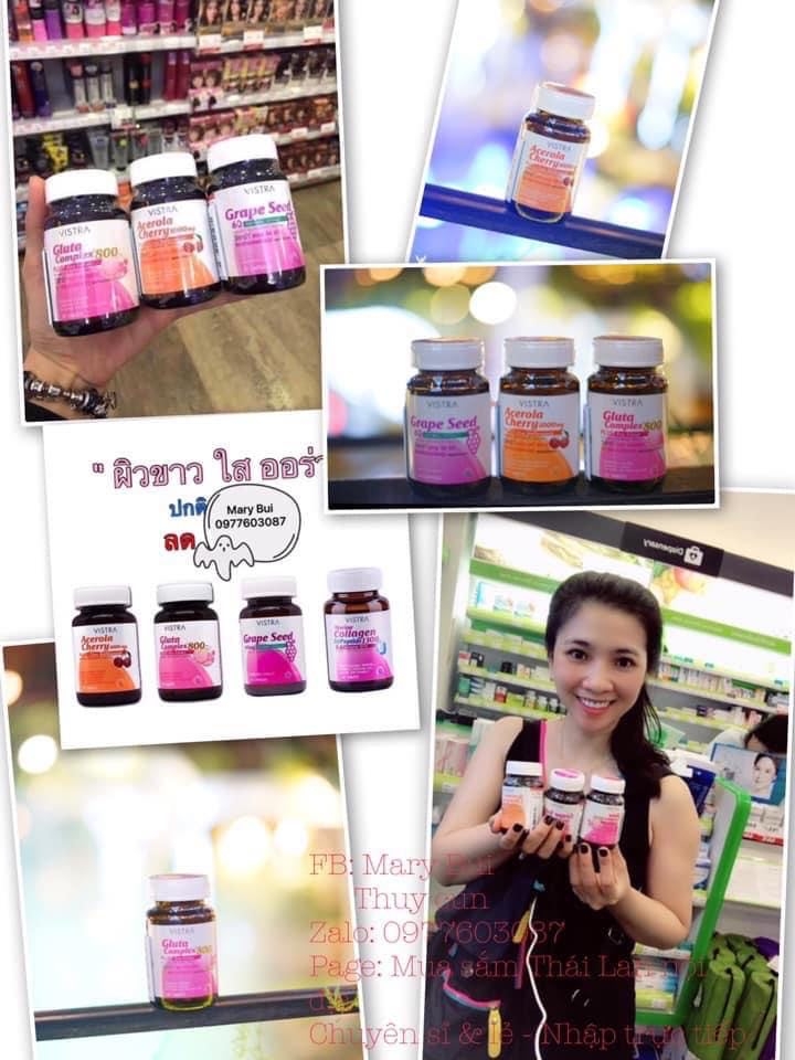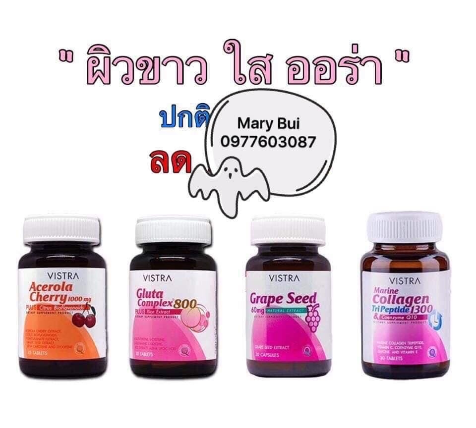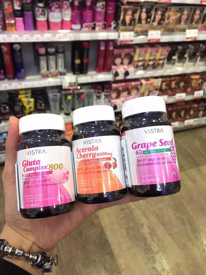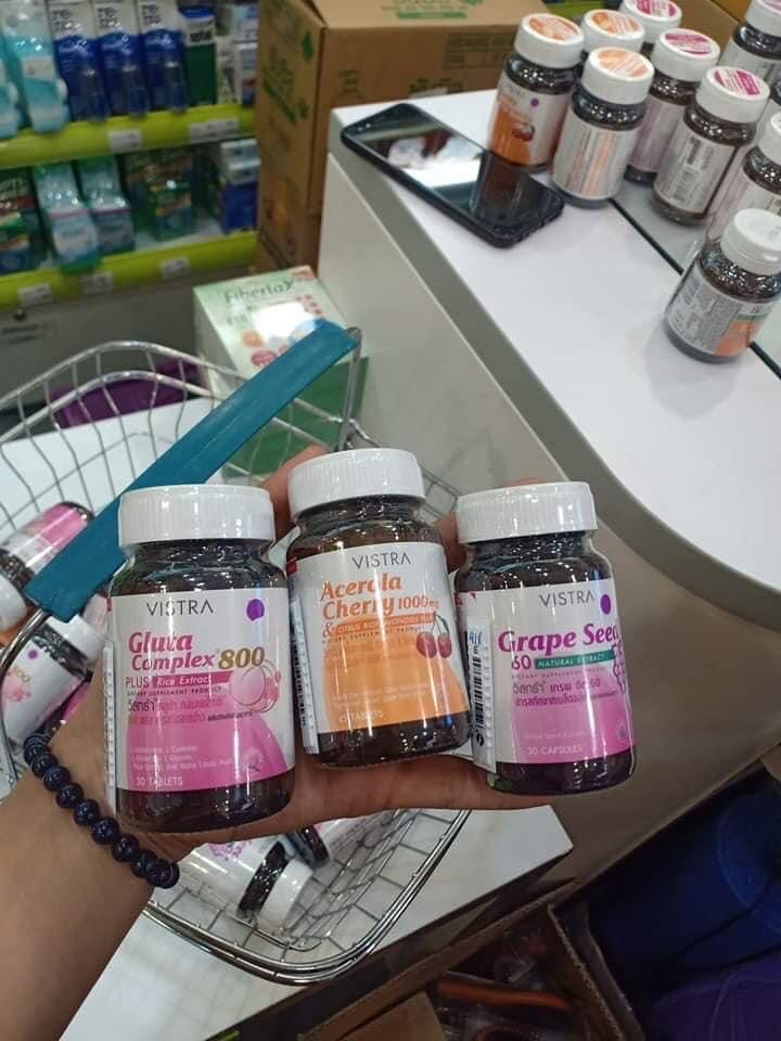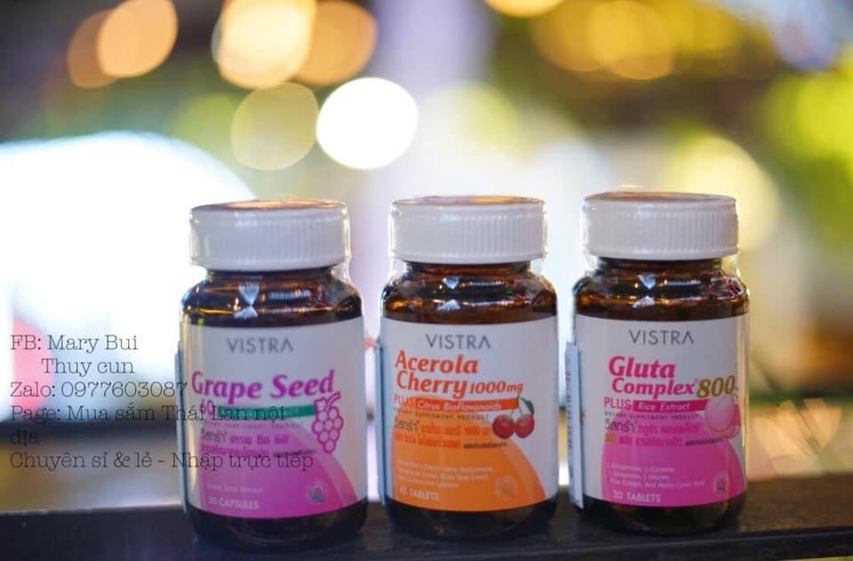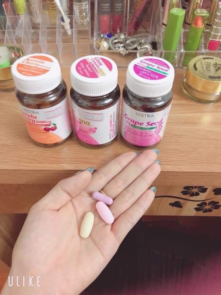 Bộ Trắng Da Vistra được kết hợp từ 3 loại sản phẩm viên uống trắng da Gluta Complex 800, viên uống trắng da Acerola Cherry và viên uống trắng da Grape Seed (hạt nho) có tác dụng làm trắng da hồng hào và mịn màng cho chị em nào muốn trắng da nhanh chóng.